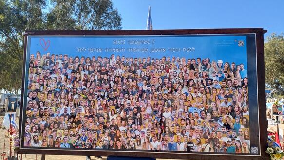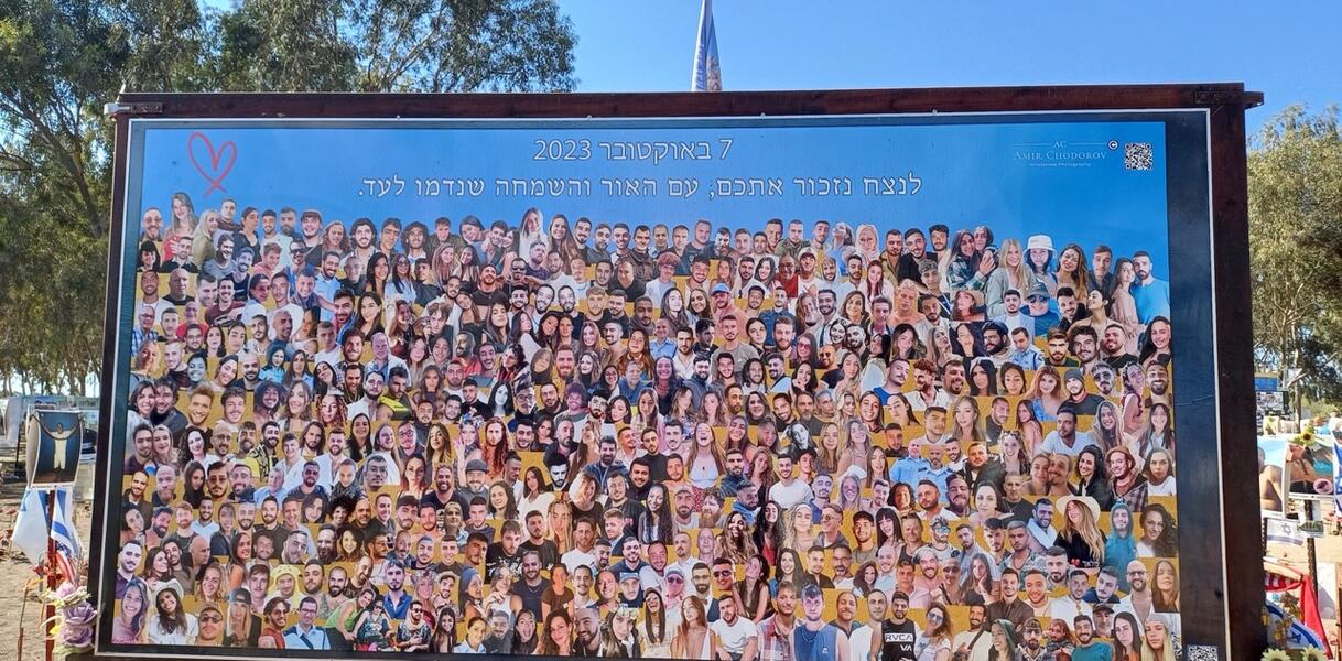 Gedenktafel mit Fotos von Menschen, die am 7. Oktober 2023 beim Angriff der palästinensischen bewaffneten Gruppe Hamas auf das Nova-Musikfestival im Süden Israels getötet wurden.