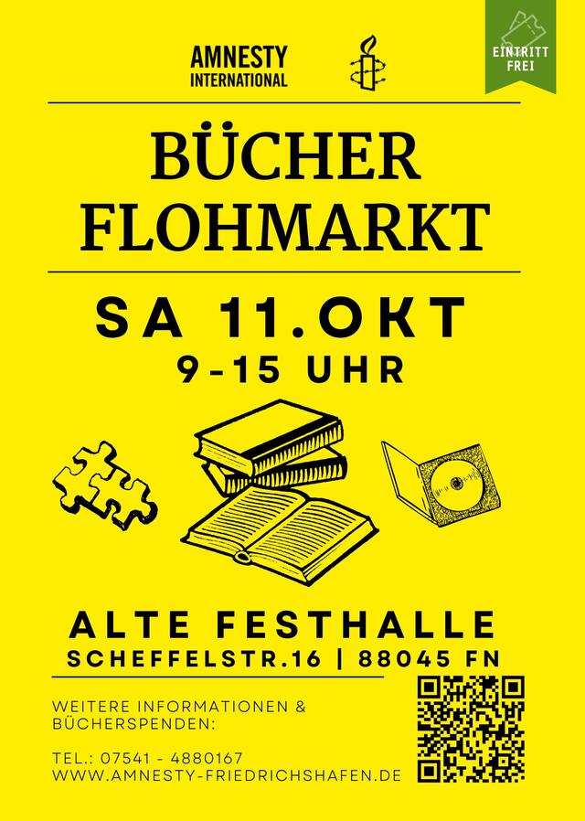 Lesen Sie gern? Dann finden Sie beim Amnesty-Bücherflohmarkt am Samstag, 11.10.2025 von 9 - 15 Uhr eine große Auswahl: ca. 20000 Bücher, sortiert in 30 Rubriken. Außerdem gibt es CDs, DVDs, Schallplatten, Kinderspiele und Puzzles sowie antiquarische Bücher. Der Bücherflohmarkt findet in der Alten Festhalle in Friedrichshafen, Scheffelstraße 16, statt. Wir freuen uns auf Sie! Nähere Informationen unter https://amnesty-friedrichshafen.de/aktionen/
