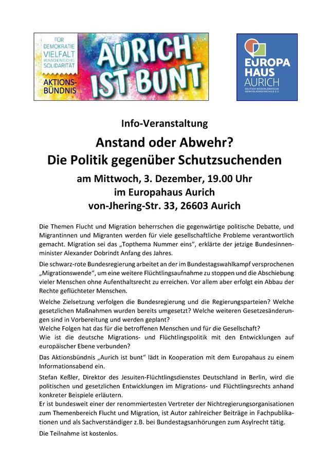 Als teil des Aktionsbündnis „Aurich ist bunt“ laden wir, die Auricher Gruppe von Amnesty International, in Kooperation mit dem Europahaus zu einem Informationsabend ein.