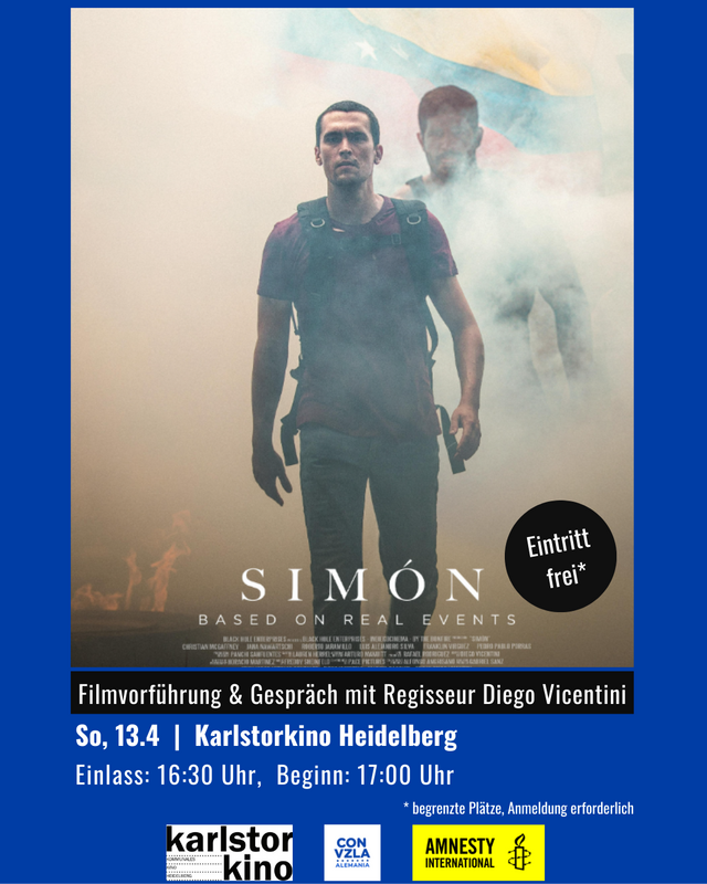 El domingo 13 de abril a las 17:00 h (entrada desde las 16:30 h) en el Karlstorkino Heidelberg, los grupos Amnesty International Hochschulgruppe Heidelberg y Venezuela Libre Heidelberg (Con Vzla) les invitan cordialmente a la proyección de la película Simón, seguida de una videoconferencia con el director Diego Vicentini.