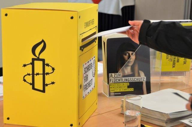 Machen Sie mit! Petitionen, Briefe und Solidaritätspostkarten liegen zum Unterschreiben bereit und können in den großen, gelben Amnesty-Briefkasten eingeworfen werden. Die Briefe und Karten werden dann an die entsprechenden Behörden weitergeleitet.