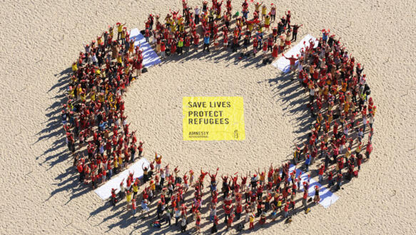 "Rettet Leben - schützt Flüchtlinge!": Aktion von Amnesty International am 8. Mai 2010 am Bondi Beach in Sydney, Australien.