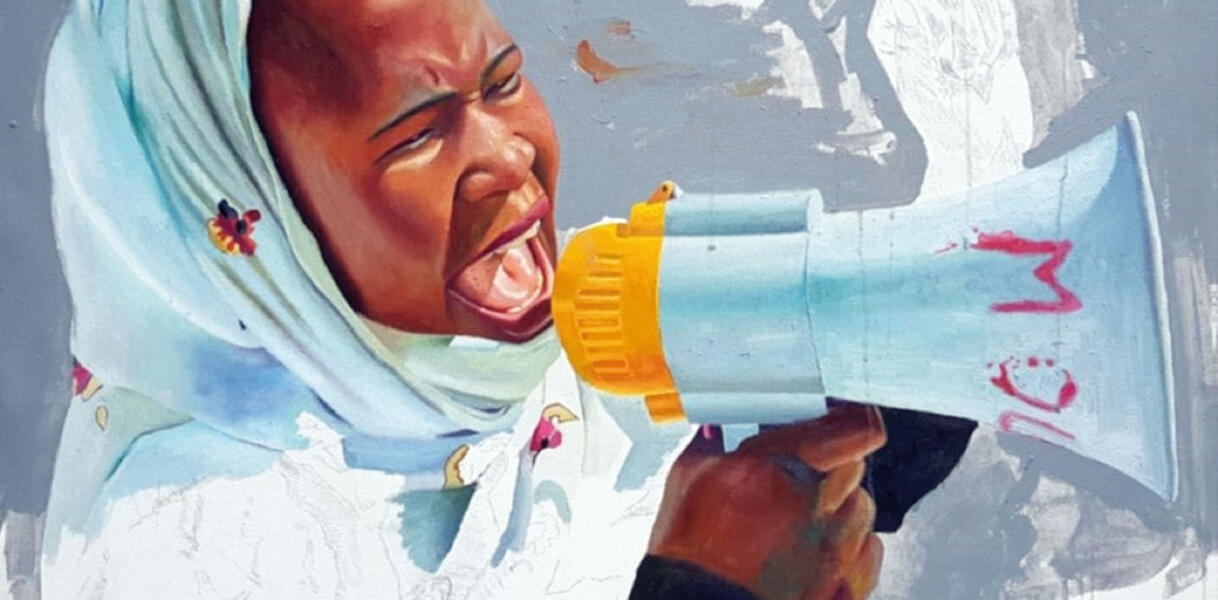 Saleh Lô, "The path to justice", Acryl und Öl auf Leinwand, 2016: "Einige meiner Kindheitsfreunde sind bei der Anti-Sklaverei-Bewegung Initiative pour la Résurgence du Mouvement Abolitionniste (IRA). Sie kämpft für die Abschaffung der Sklaverei, für Chancengleichheit und ein gerechtes Mauretanien. 2015 wurde der Vorsitzende der Bewegung, Biram Dah Abeid, zu zwei Jahren Haft verurteilt. Er hatte Aktivistinnen und Aktivisten der IRA unterstützt, die sich trotz eines Verbots der mauretanischen Regierung im Süden des Landes gegen Sklaverei einsetzten. Damals gab es in Nouakchott mehrere Demonstrationen gegen die Inhaftierung von Dah Abeid. Das Bild zeigt einen dieser Protestmärsche. Die Demonstrierenden beeindruckten mich sehr. Sie gaben nicht auf, obwohl die Polizei versuchte, sie vom Justizministerium fernzuhalten und einige von ihnen sogar für mehrere Tage ins Gefängnis steckte. Über die IRA bekam ich auch Kontakt zu befreiten Sklavinnen und Sklaven, die ich dann porträtierte."