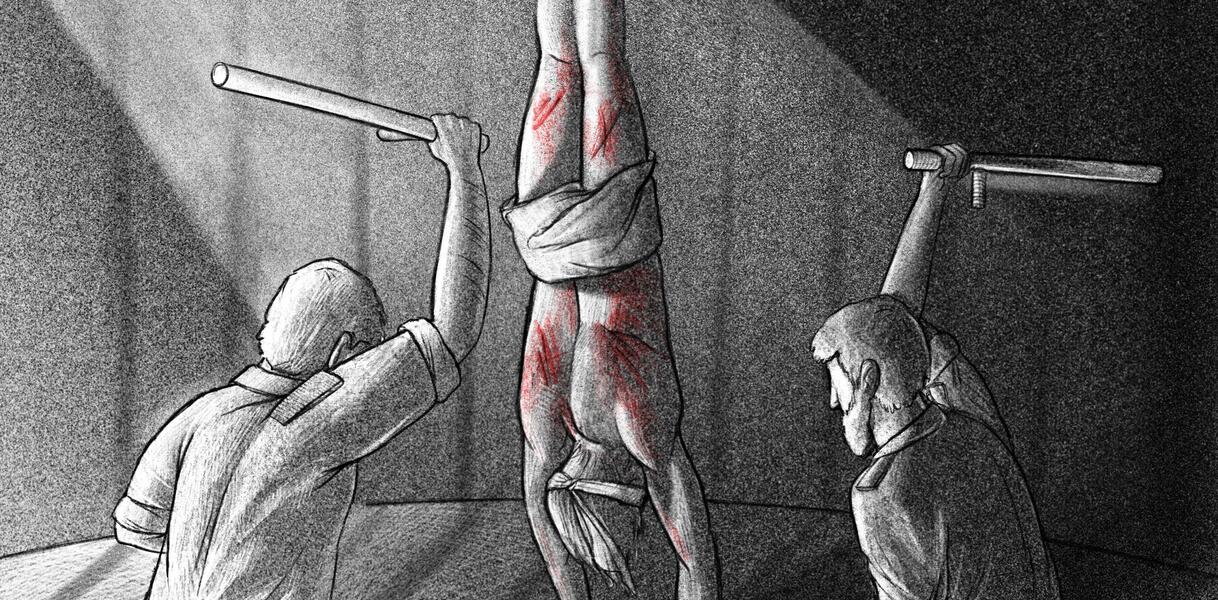 Illustration einer in iranischen Gefängnissen verwendeten Foltermethode nach den Protesten im November 2019
