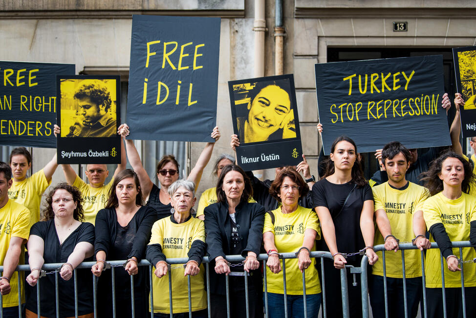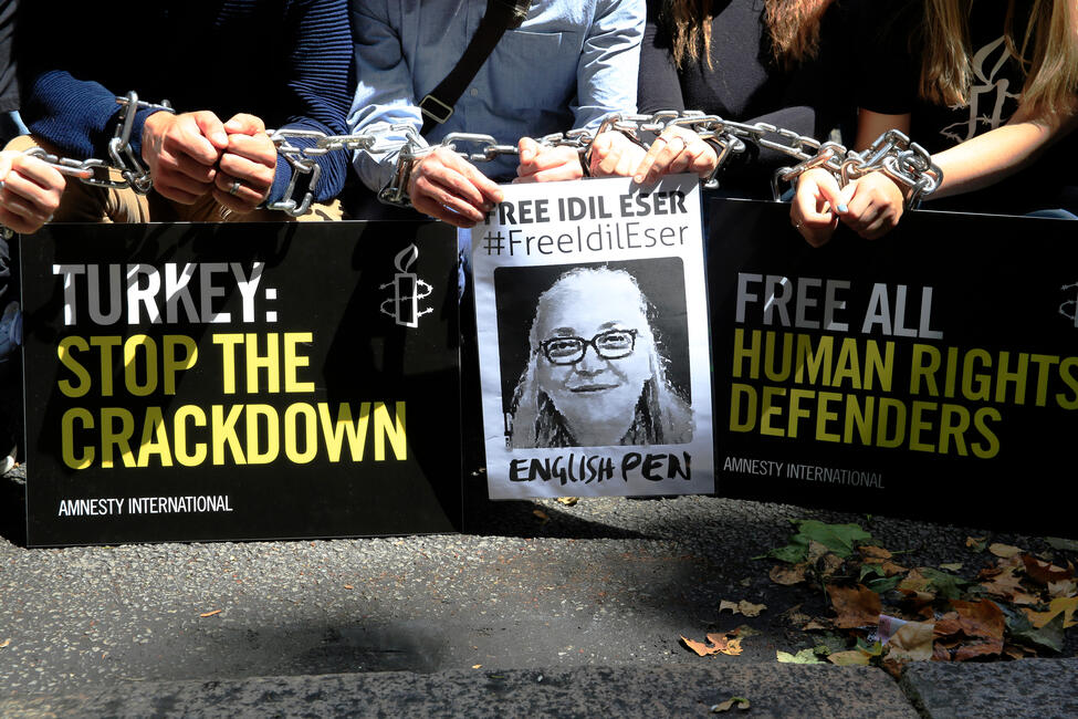 İdil Eser, Direktorin der türkischen Sektion von Amnesty International, wurde am 5. Juli gemeinsam mit anderen Menschenrechtsaktivistinnen und -aktivisten nahe Istanbul festgenommen. Ihr wird laut Anklageschrift vorgeworfen, Terrororganisationen unterstützt zu haben. Bei einer Verurteilung drohen ihr bis zu 15 Jahre Haft. Am 25. Oktober wurde sie, ebenso sieben andere Menschenrechtsverteidigerinnen und -verteidiger ohne Auflagen aus der Untersuchungshaft entlassen.