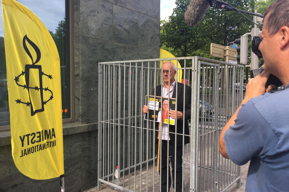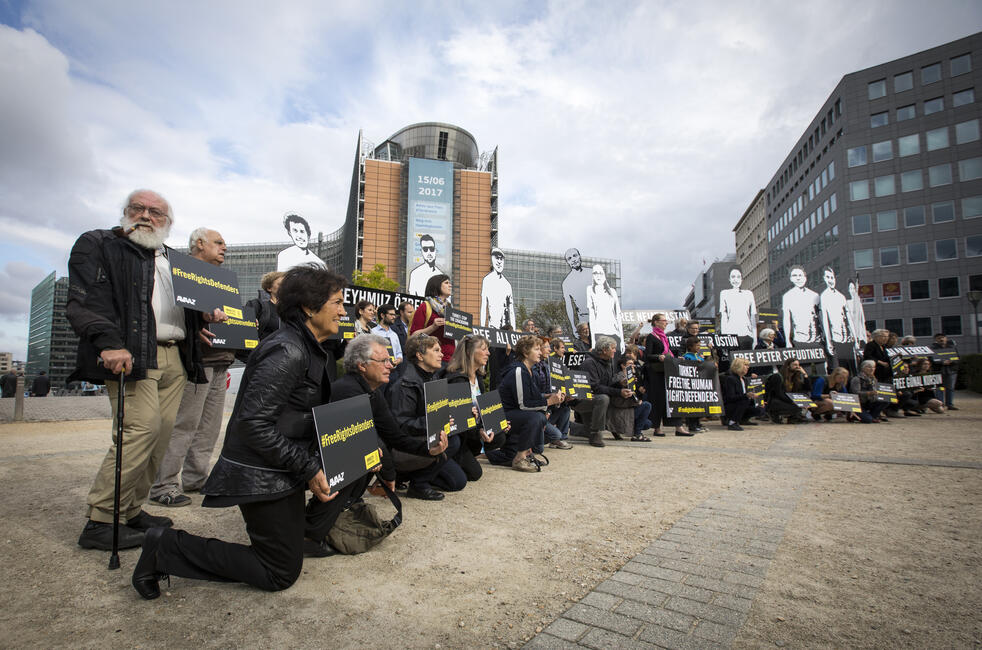 Am Montag haben zahlreiche Amnesty-Unterstützerinnen und -Unterstützer mit einer öffentlichen Aktionen vor der Berliner Mauer und der türkischen Botschaft in Berlin die Freilassung der inhaftierten Menschenrechtler gefordert.