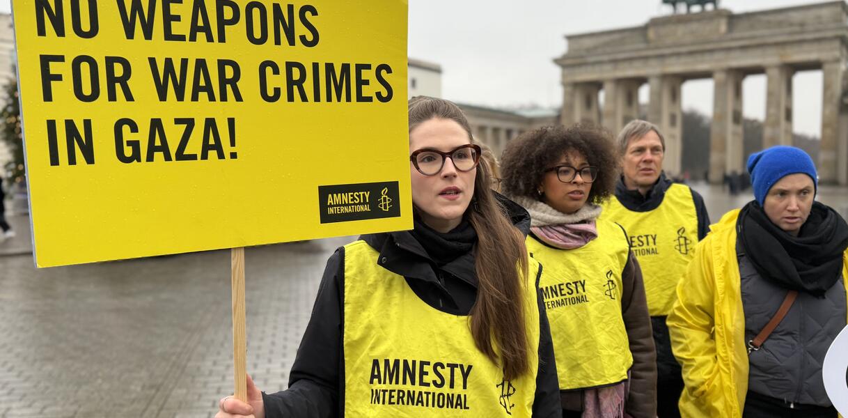 "Keine Waffen für Kriegsverbrechen in Gaza": Amnesty-Protest am 5. Dezember 2025 in Berlin gegen die Entscheidung der deutschen Bundesregierung, den Genehmigungsstopp für Waffenexporte nach Israel aufzuheben.